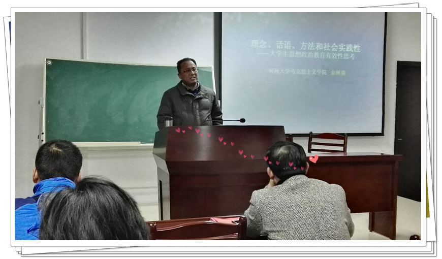 为进一步提高我中心思想政治理论课教师课堂教学能力和科研教学成果转化水平,推进思想政治理论课课堂教学改革,增强教学的针对性和实效性,12月26日下午,在秀山校区汇文楼A楼308报告厅,中心特邀河海大学教授、博导金林南博士为全体师生作思想政治理论课专题学术讲座。讲座由高敏教授主持。